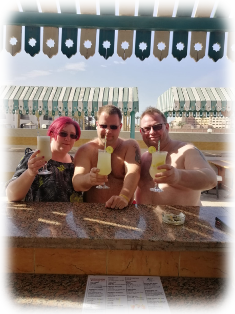 Nach 'nem für Nico's Verhältnisse kargen Mahl, ging et anne Poolbar, um datt Tagebuch weiter zu schreibseln. Micha gesellte sich zu uns und frachte uns kurzerhand: “Na, Lust auf 'ne Runde Pool?” Aba SIcha datt, Wasser schadet nie, also rein inne Badeklamotten und ab ins warme Nass (Jap, der Pool is beheizt).