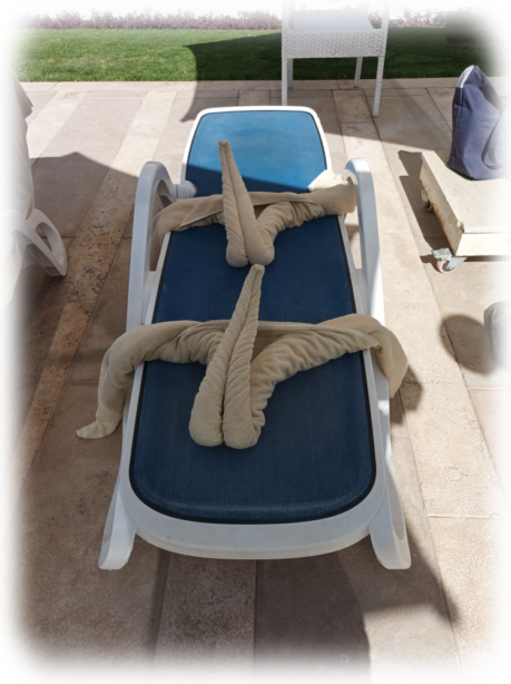 Nachdem wir ein Gläschen Sekt zum Anstoßen getrunken hatten, machten wir es uns auf den Liegen bequem und ließen uns die ägyptische Sonne auf die Haut scheinen. Nach einer weile stand Micha auf und ging in sein Zimmer. Als er wieder zu den Liegen zurückkehrte, trommelte uns alle zusammen. Wir sollten uns anschauen, was in seinem Zimmer passiert sei. (Anmerkung: wir wussten es schon). Der Roomboy hatte ganze Arbeit geleistet.