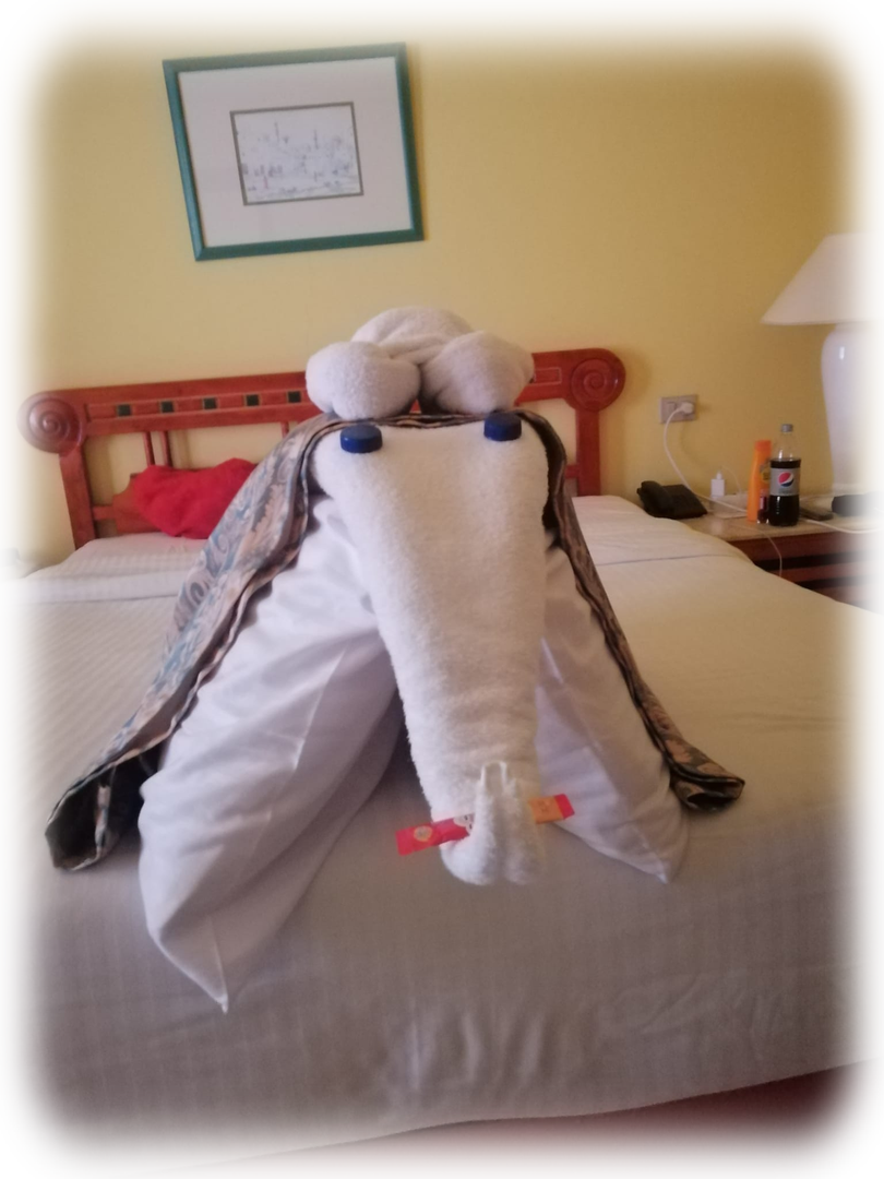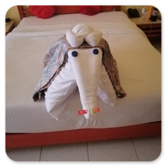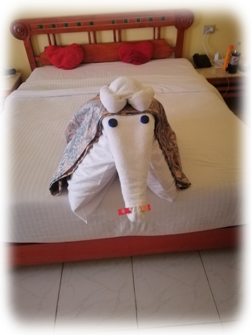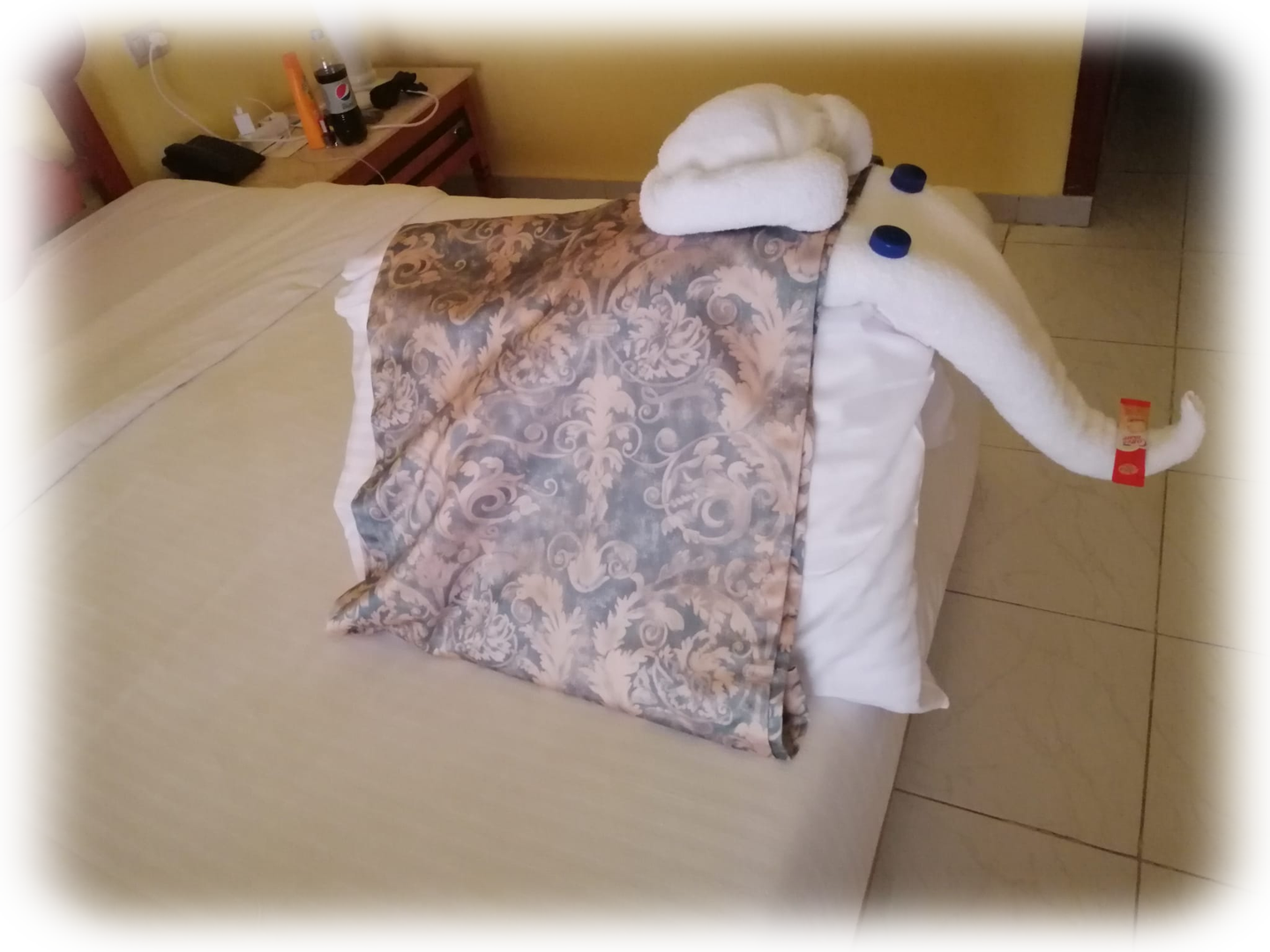 Als wir vom Frühstück in unser Hotelzimmer zurück kamen, um uns für den Strand vorzubereiten, war das Staunen riesig. Da hatte doch der Roomboy eine kleine aber feine Überraschung für uns vorbereitet.