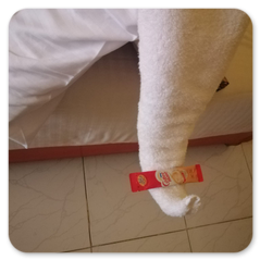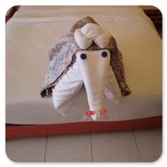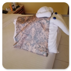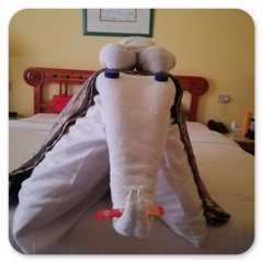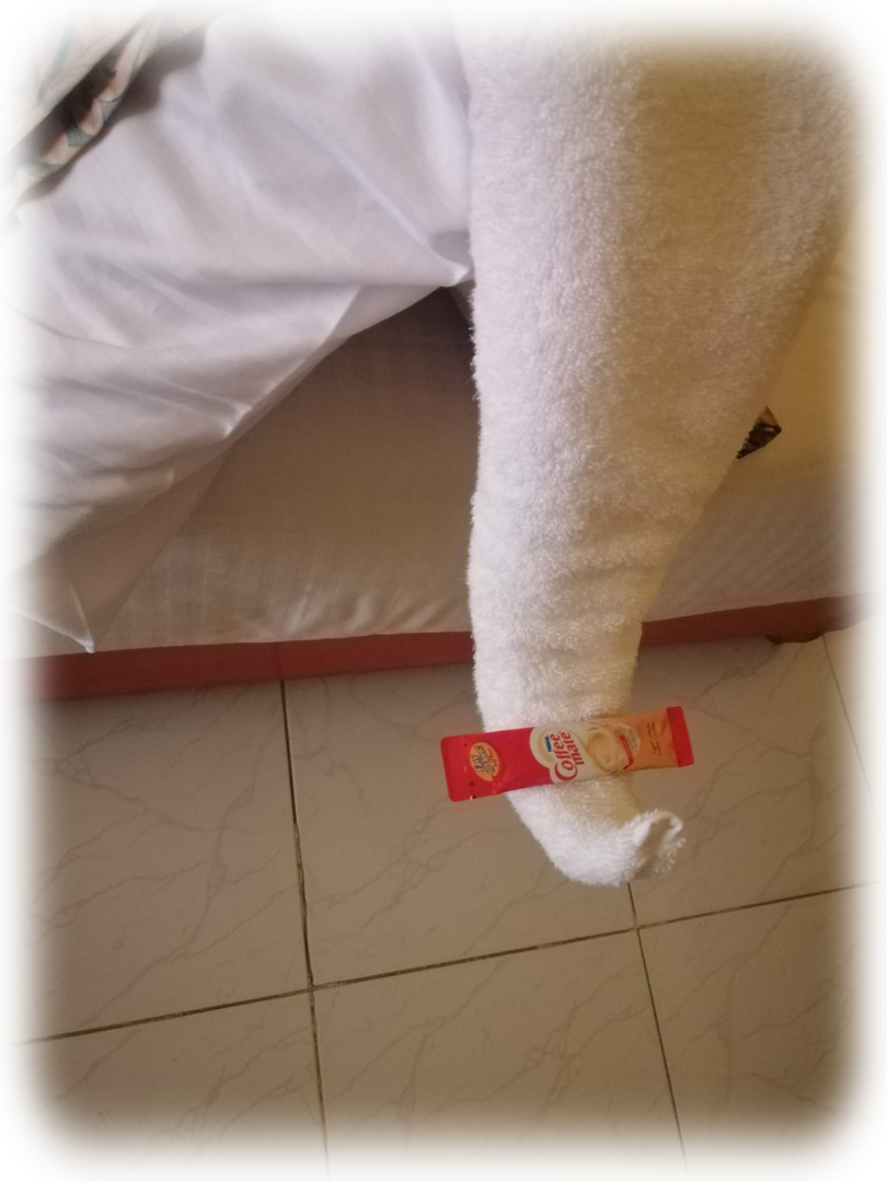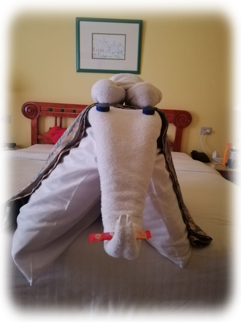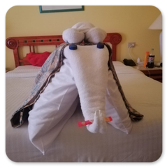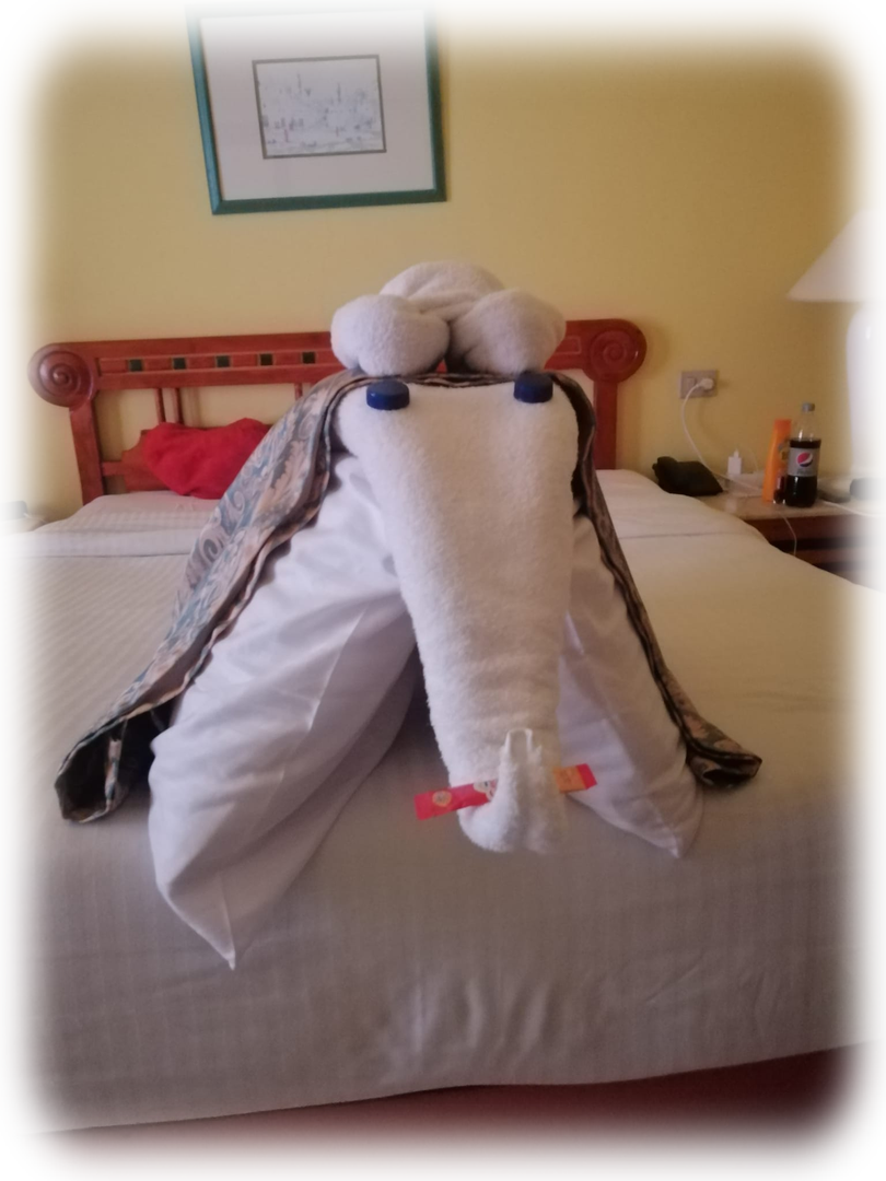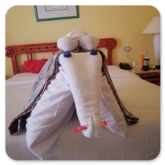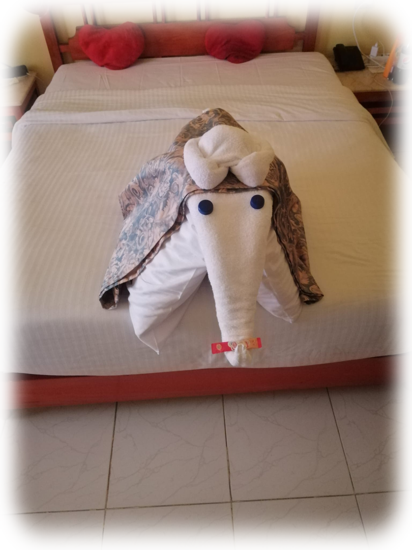 Als wir vom Frühstück in unser Hotelzimmer zurück kamen, um uns für den Strand vorzubereiten, war das Staunen riesig. Da hatte doch der Roomboy eine kleine aber feine Überraschung für uns vorbereitet.
